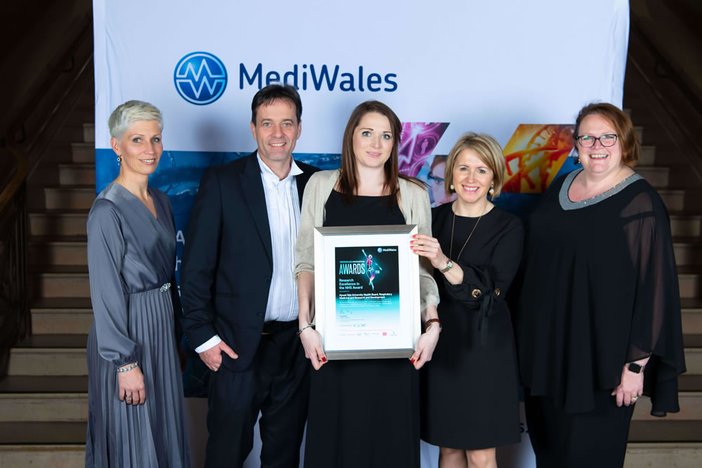 Pictured accepting the award, (l-r) is Claire Banks, Professor Keir Lewis,Rachel Gemine, Bev Luchman and Dr Nicky Williams (HCRW).